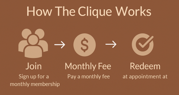 Create a savings account by joining our membership, The Clique. Each month you’ll bank money that you can use toward your next treatment and get exclusive perks along the way. It’s a beauty win-win!